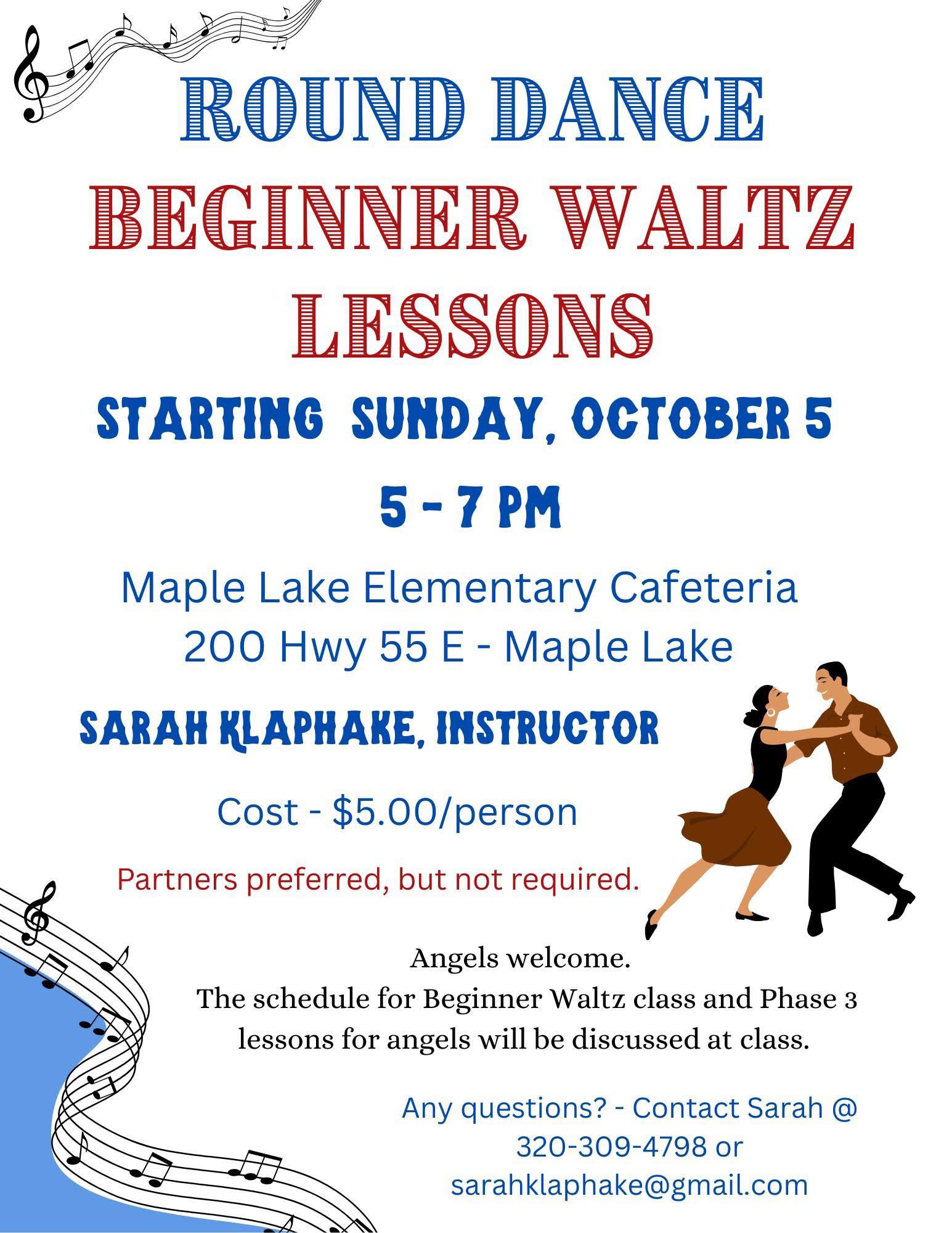 Round Dance Class (Instructor/Cuer Sarah Klaphake – “Beginner Waltz Lessons” 5:00-7:00 pm). Rounds with Sarah Flyer