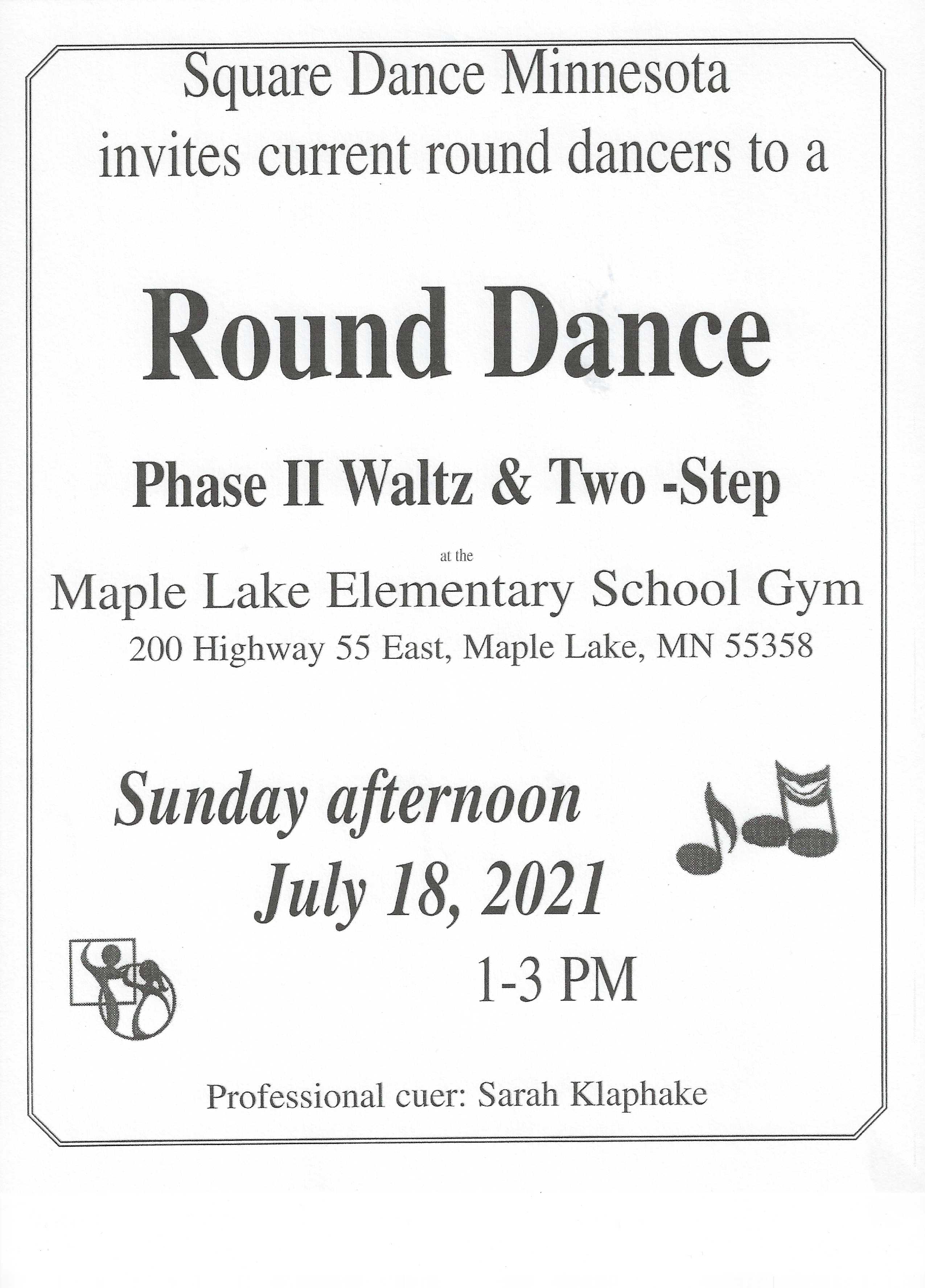 Round Dance (Cuer Sarah Klaphake – “Phase II Waltz and Two-Step,” 1:00-3:00 pm), potluck snack table during dance. SDM Round Dance Flier