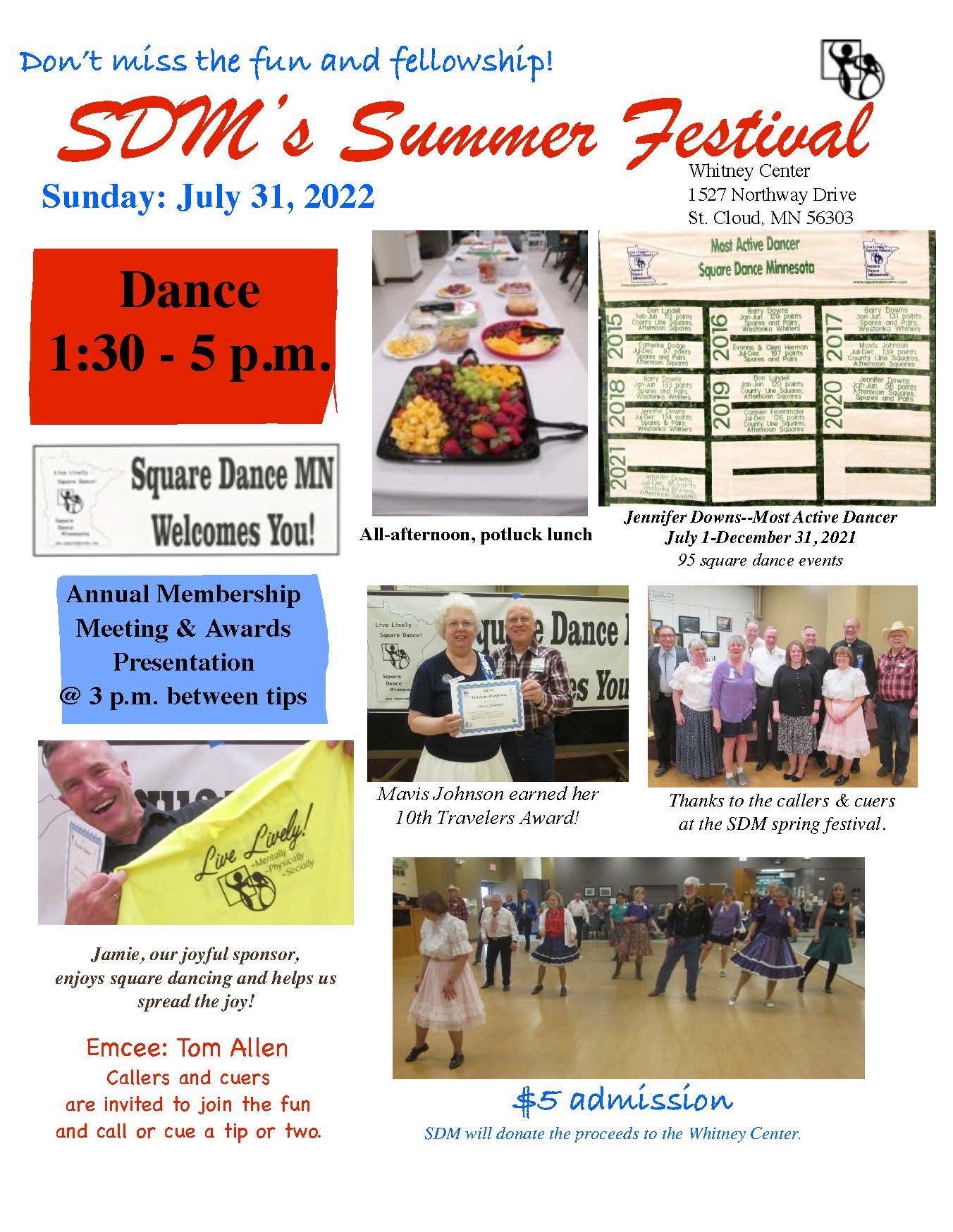 SDM “Summer Festival” Square Dance (Caller Tom Allen, et al – “Mainstream” 1:30-5:00 pm; Cuer Sarah Klaphake, et al – “Rounds” between tips), annual membership meeting and awards – @ 3:00 pm (between tips), potluck, proceeds (after expenses) donated to the Whitney Center. SDM Summer Festival Flier