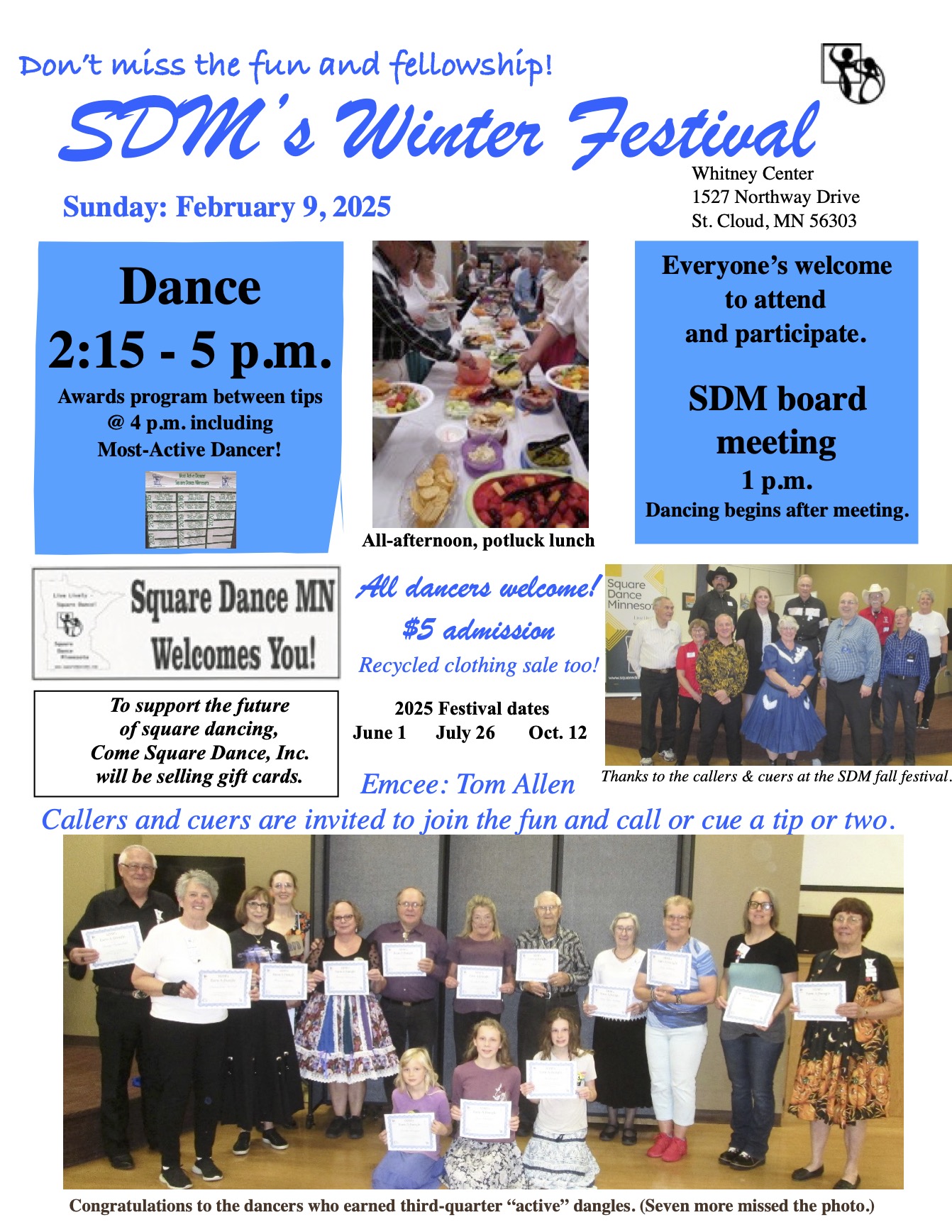 SDM “Winter Festival” – Board meeting 1:00-2:15 pm; Callers Tom Allen, et al – “Mainstream” square dancing and Cuers Sarah Klaphake, et al – “Round” dancing between tips 2:15-5:00 pm; and awards presentation @ 4:00 pm (between tips), potluck during the dance. SDM Winter Festival Flyer