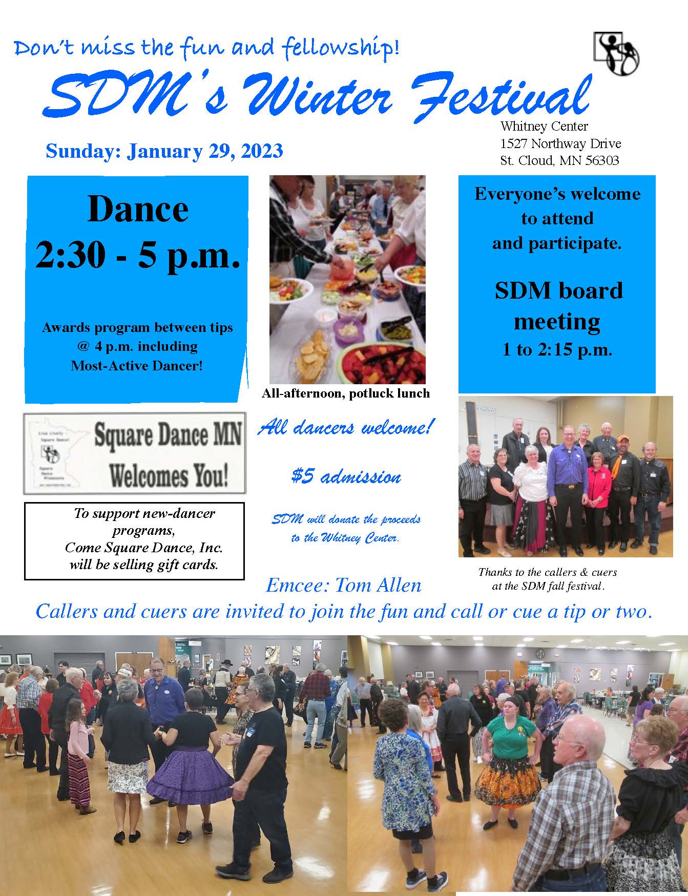 SDM “Winter Festival” – Board meeting 1:00-2:15 pm; Callers Tom Allen, et al – “Mainstream” square dancing and Cuers Sarah Klaphake, et al – “Round” dancing between tips 2:30-5:00 pm; and awards presentation @ 4:00 pm (between tips), potluck during the dance. SDM Winter Festival Flier