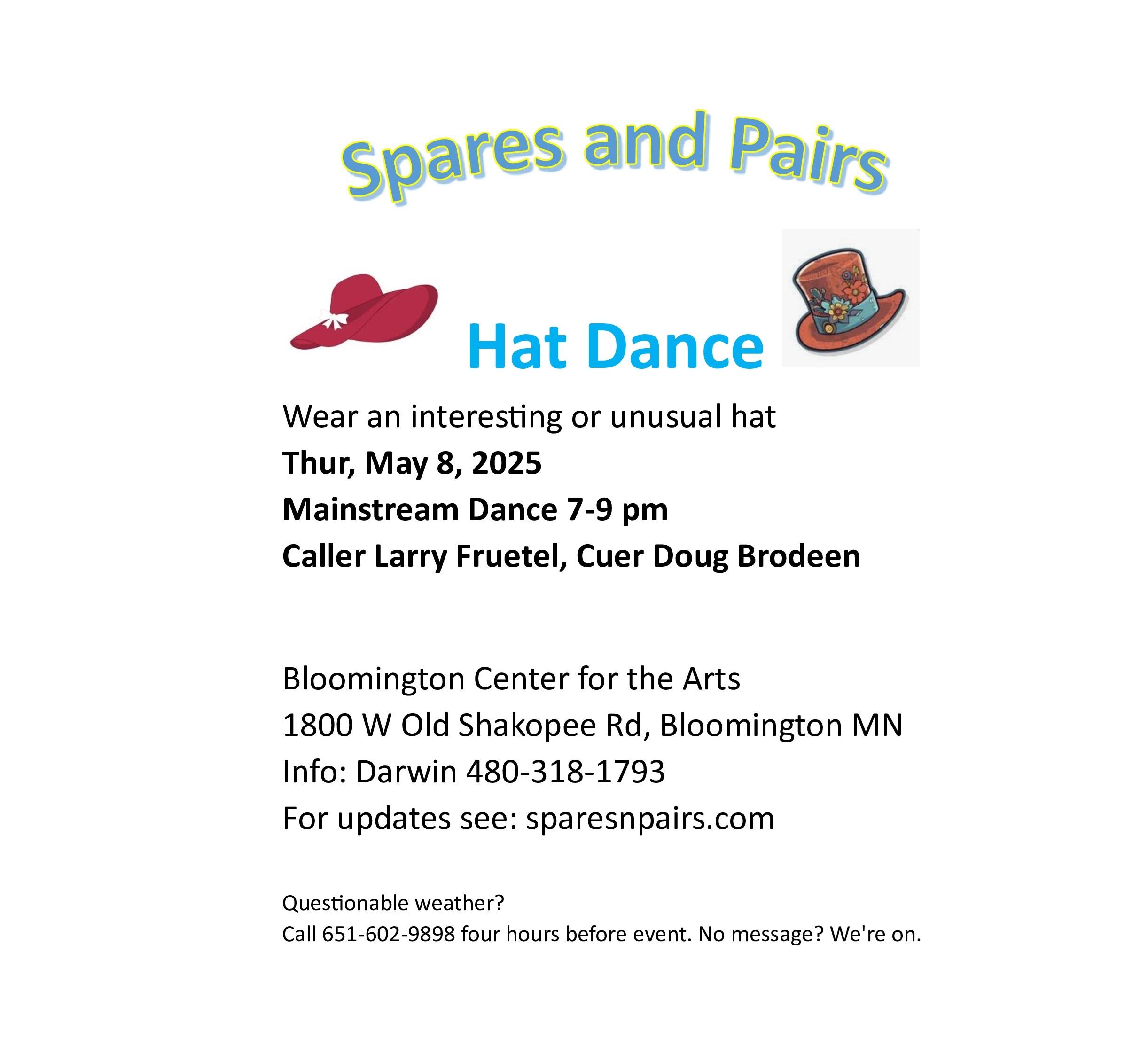 “Hat Dance” Square Dance (Caller Larry Fruetel – “Mainstream” 7:00-9:00 pm; Cuer Doug Brodeen – “Rounds” between tips). Wear your favorite hat. Spares & Pairs Flyer