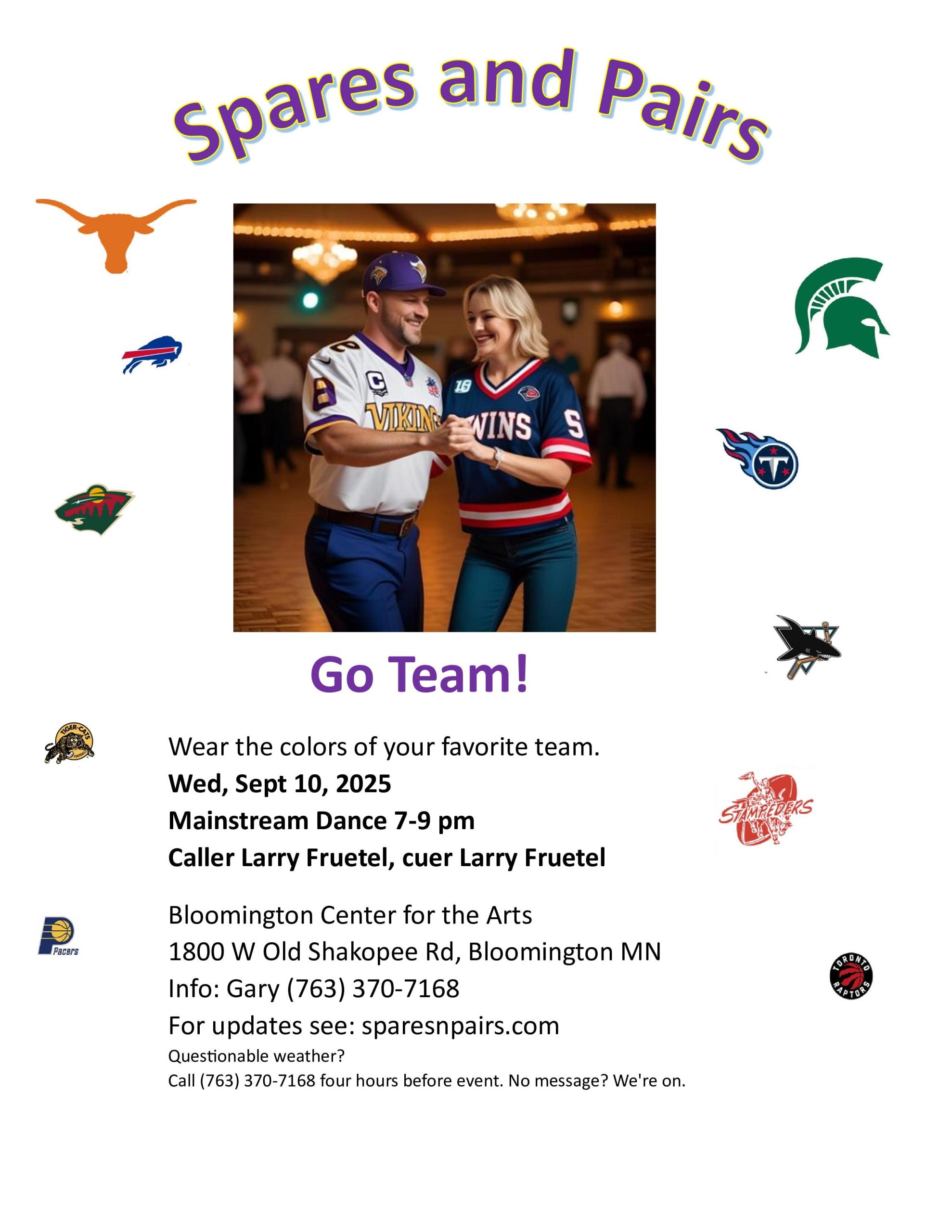 “Go Team!” Square Dance (Caller Larry Fruetel – “Mainstream” 7:00-9:00 pm; Cuer Larry Fruetel – “Rounds” between tips). Note new day. Spares & Pairs Flyer