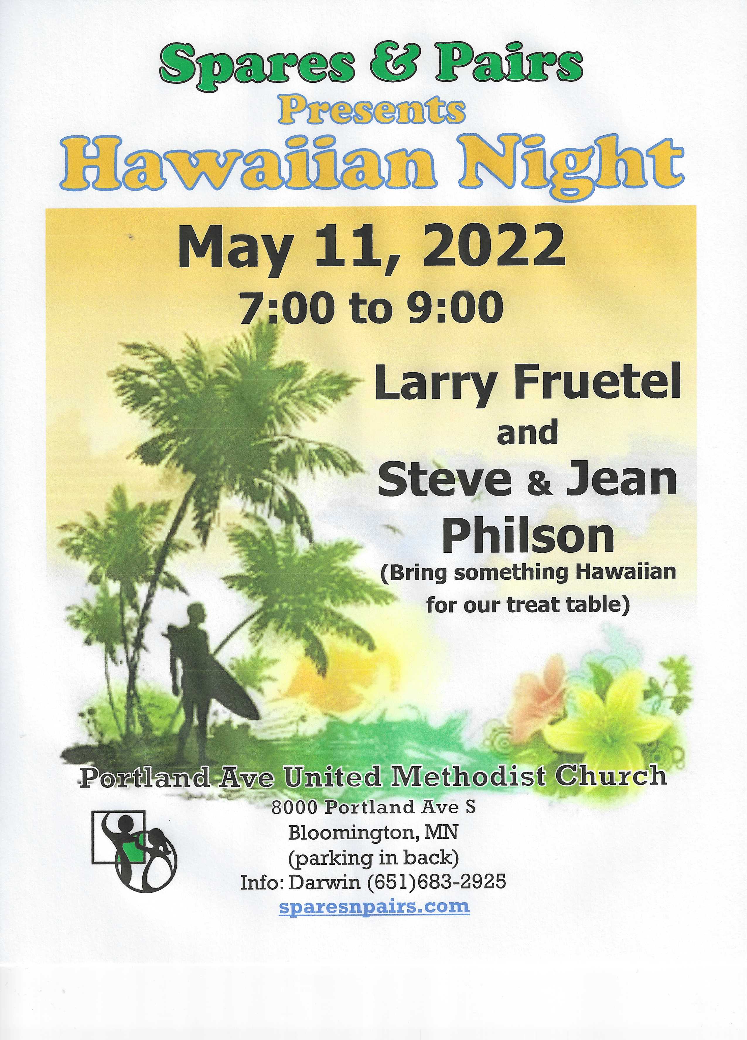 “Hawaiian Night” Square Dance (Caller Larry Fruetel – 7:00-9:00 pm; Cuers Steve and Jean Philson, “Rounds” between tips), potluck.  Spares & Pairs Flier