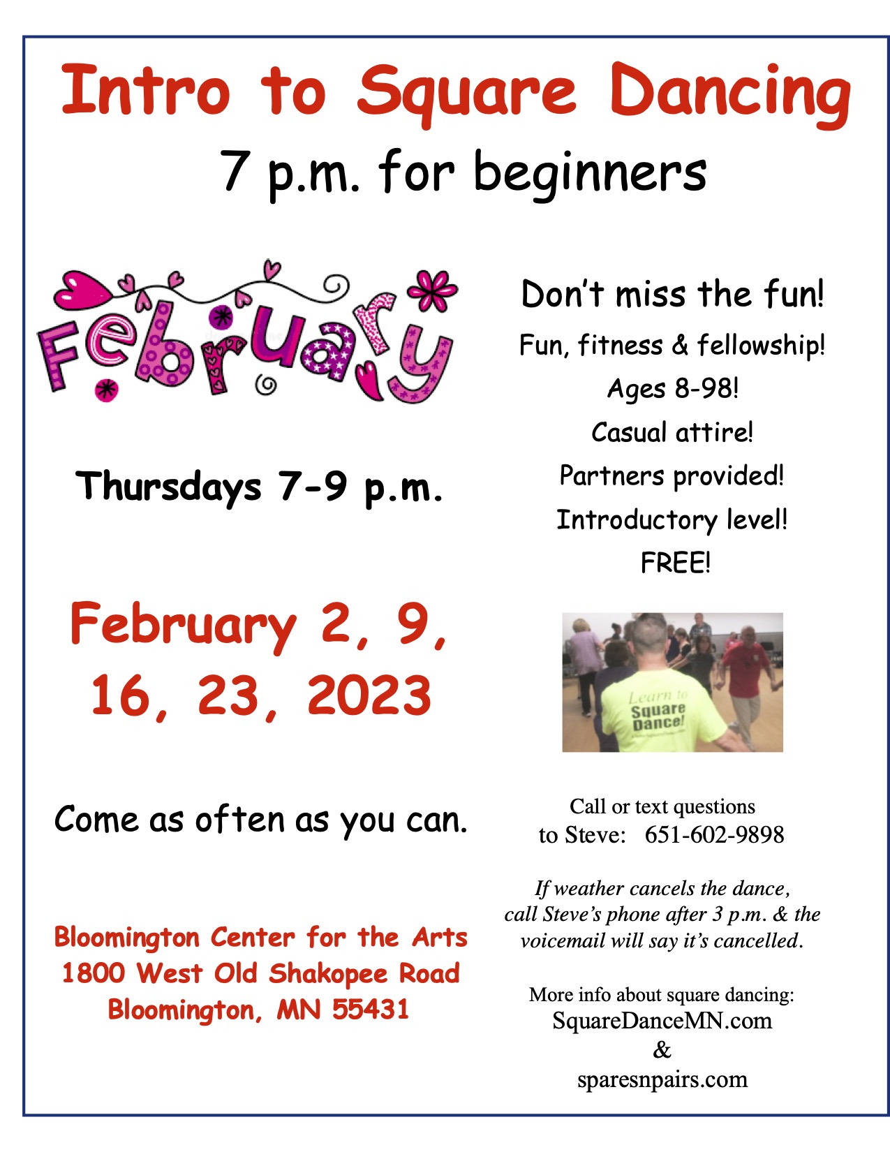 “Intro to Square Dancing” – Beginner Square Dancing 7:00-9:00 pm. casual attire, free. Spares & Pairs Flier