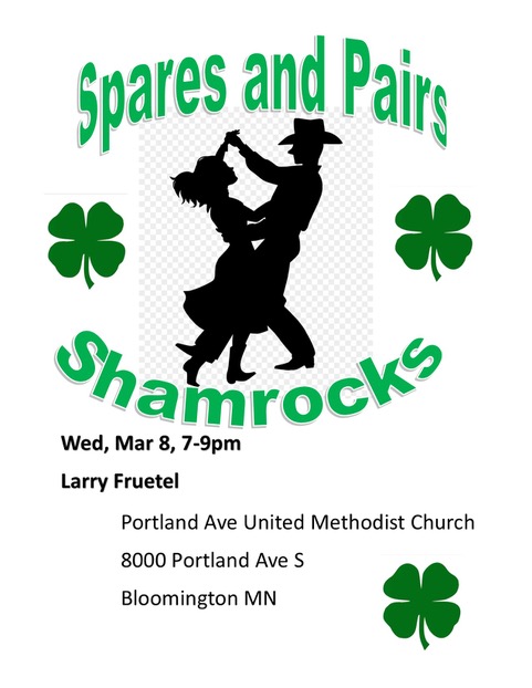 “Shamrocks” Square Dance (Caller Larry Fruetel – 7:00-9:00 pm), potluck. Spares & Pairs Flier