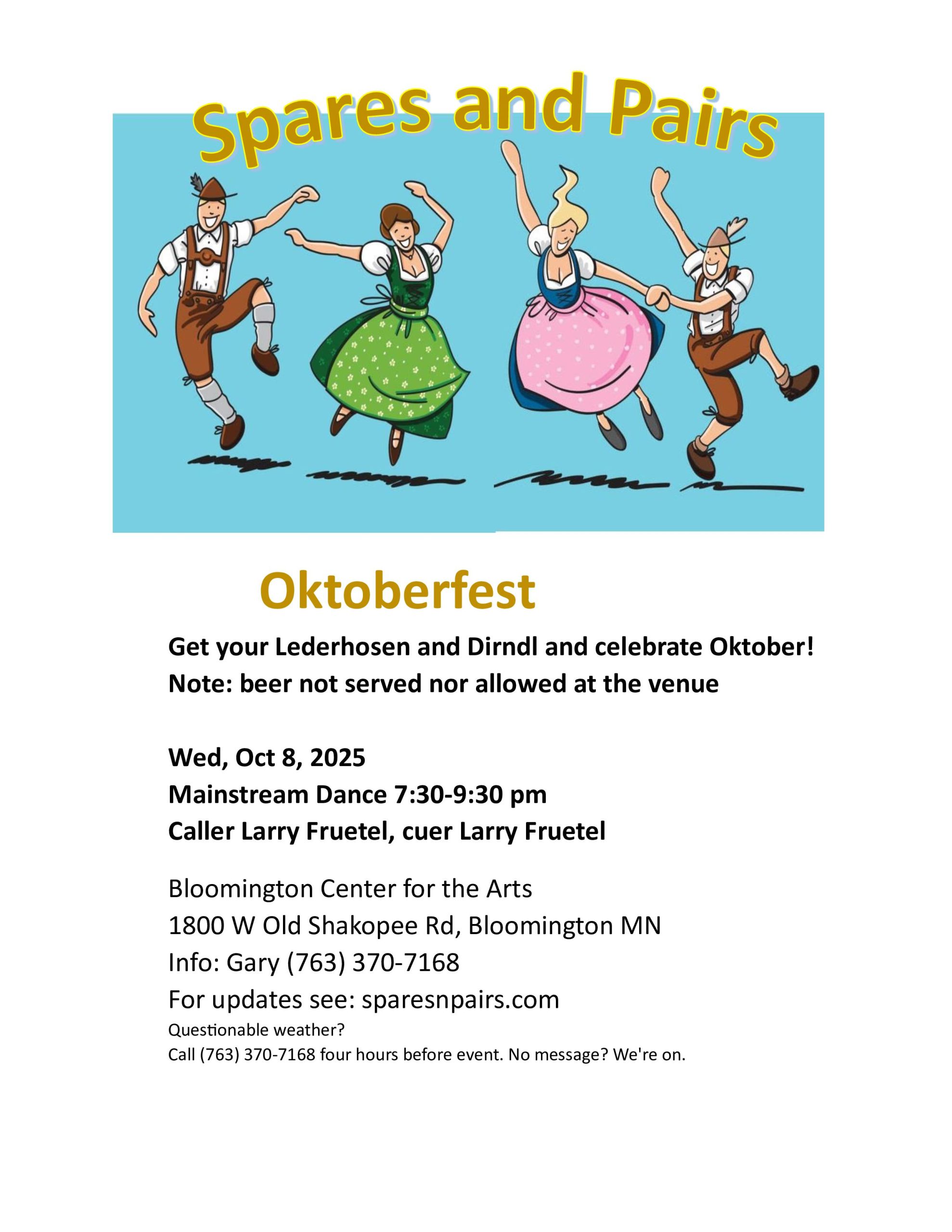 “Oktoberfest” Square Dance (Caller Larry Fruetel – “Mainstream” 7:30-9:30 pm; Cuer Larry Fruetel – “Rounds” between tips). Note new time. Spares & Pairs Flyer