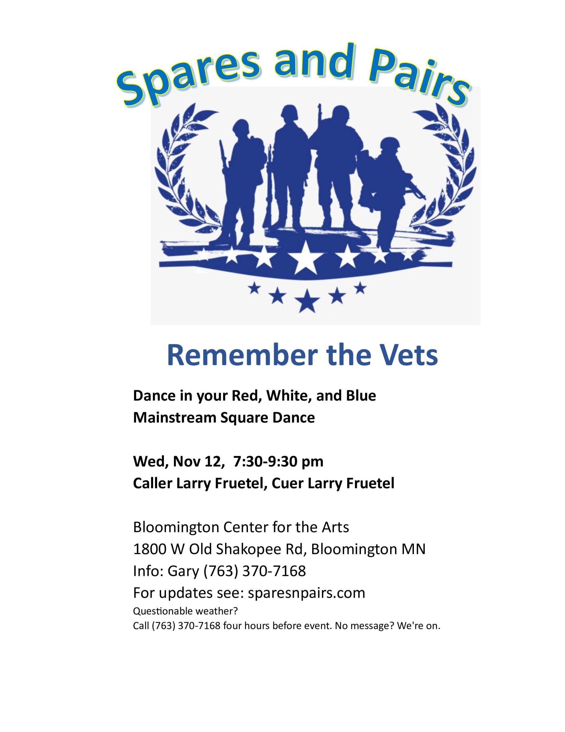 “Remember the Vets” Square Dance (Caller/Cuer Larry Fruetel – “Mainstream” 7:30-9:30 pm; “Rounds” between tips). Spares & Pairs Flyer