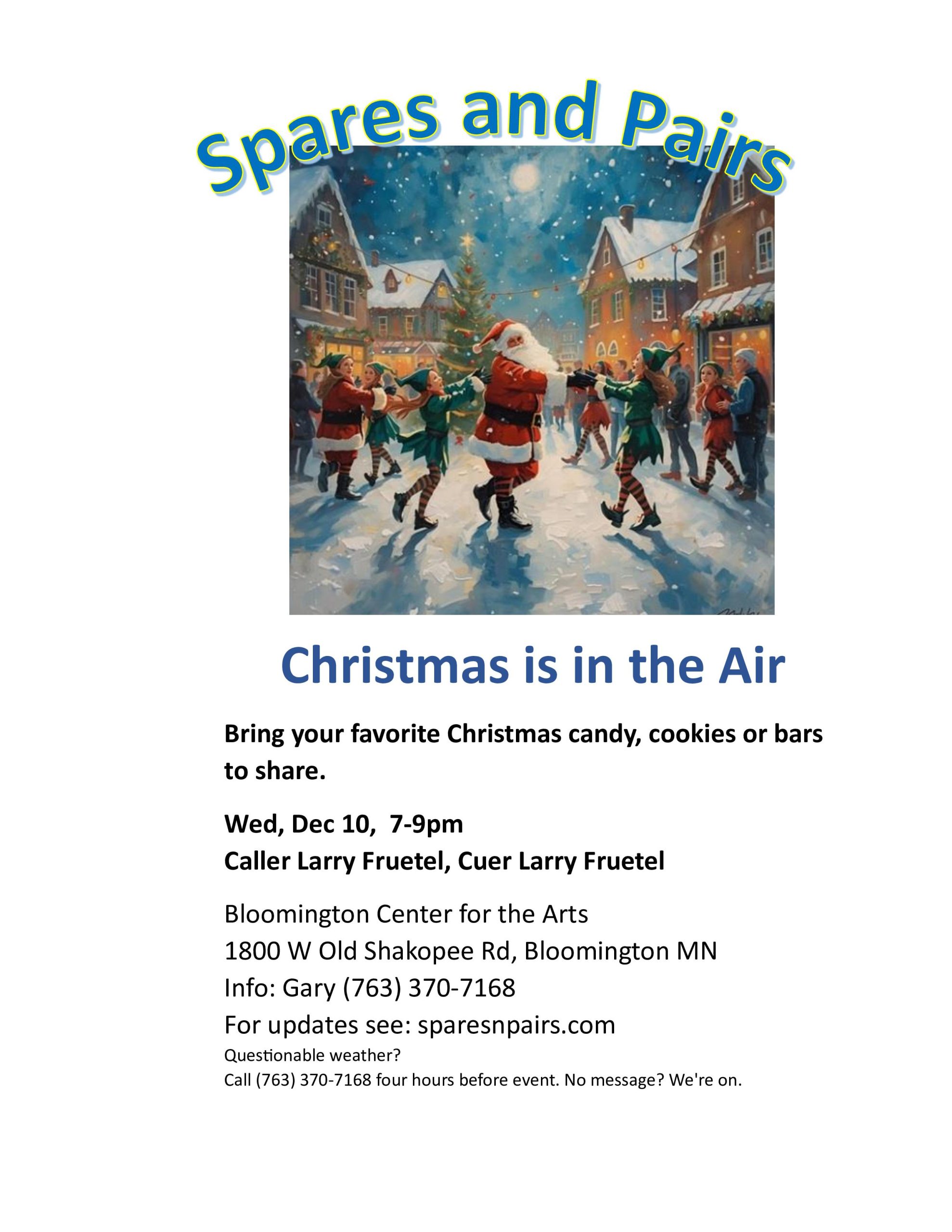 “Christmas is in the Air” Square Dance (Caller/Cuer Larry Fruetel – “Mainstream” 7:00-9:00 pm; “Rounds” between tips). Note new time. Spares & Pairs Flyer