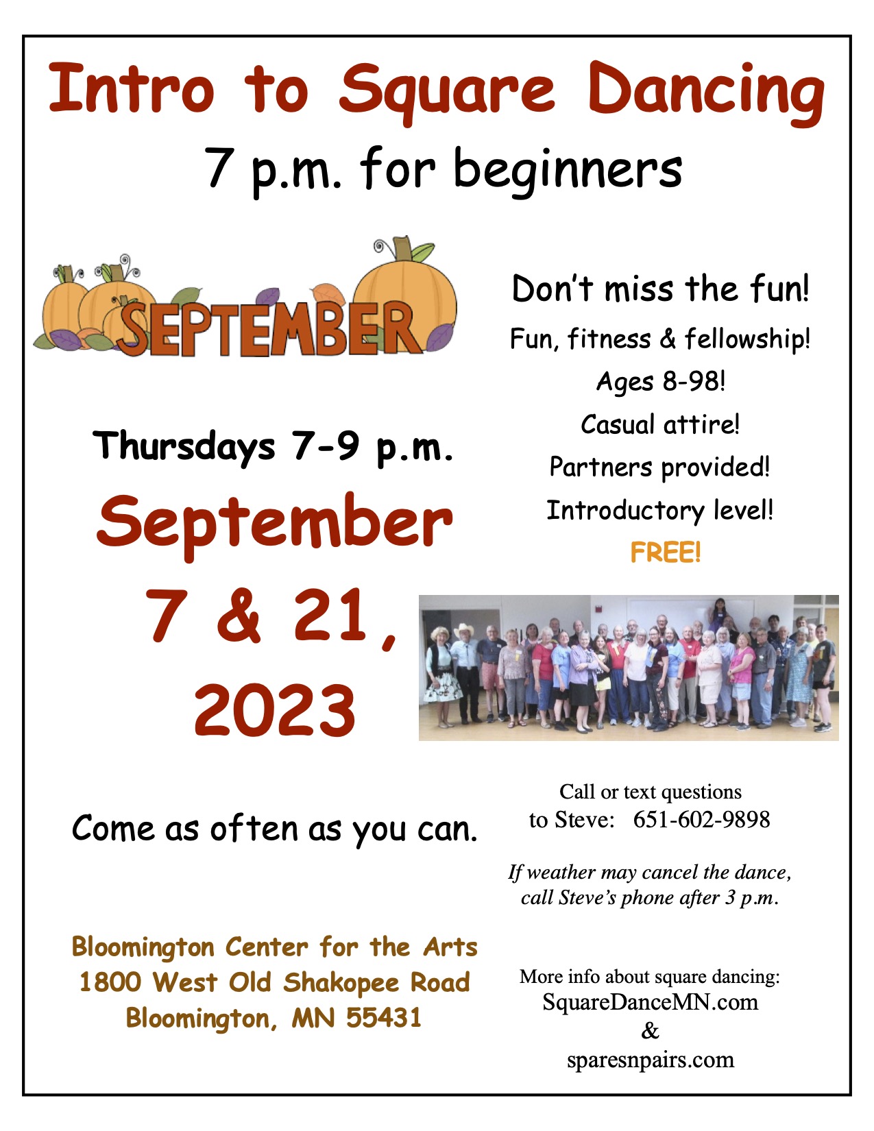 “Intro to Square Dancing” – Beginner Square Dancing 7:00-9:00 pm. Casual attire, free. Spares & Pairs Flier