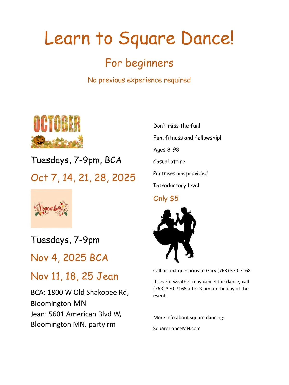Intro to Square Dancing (Caller/Instructor Larry Fruetel “Beginner Square Dancing” 7:00-9:00 pm). Casual attire. Spares & Pairs Flyer