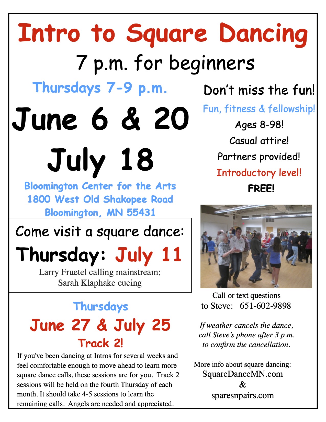 “Intro to Square Dancing” – Beginner Square Dancing 7:00-9:00 pm. Casual attire, free. Spares & Pairs Flyer