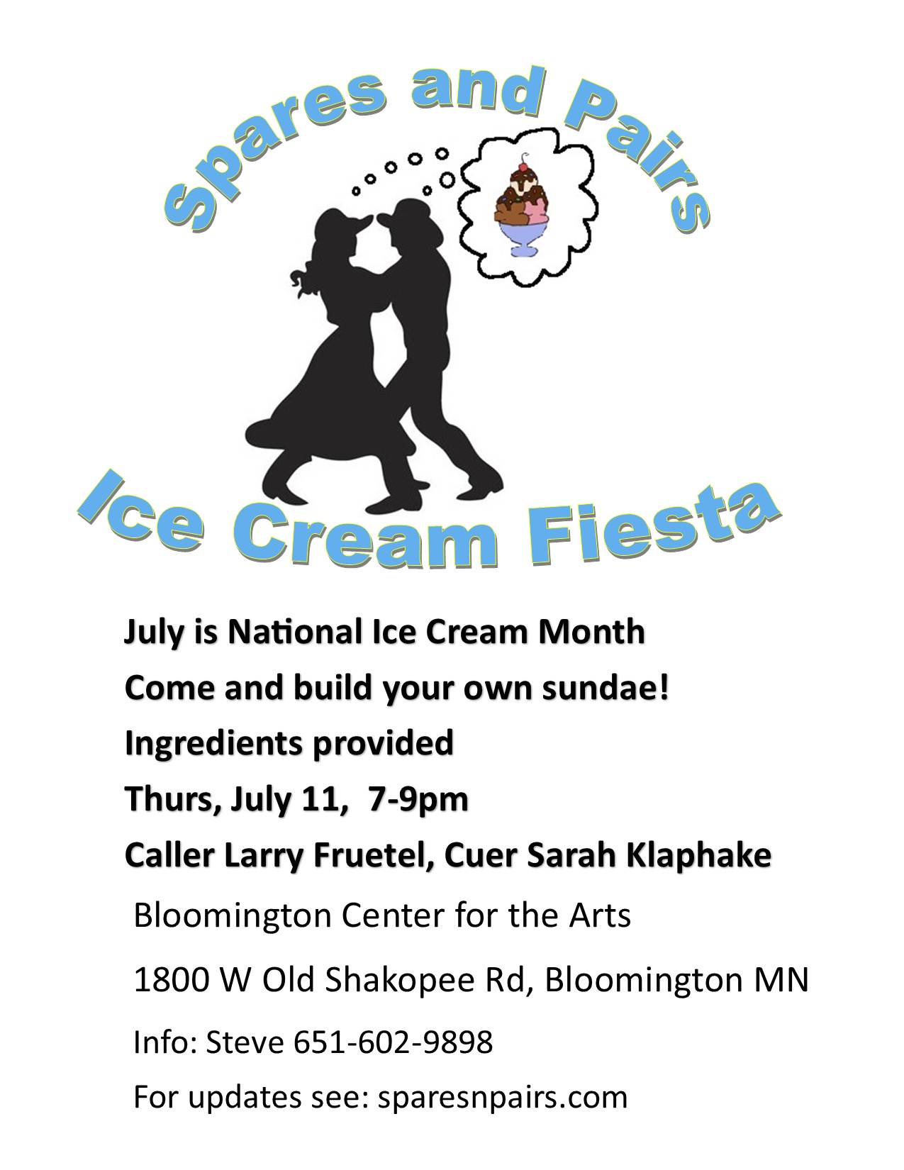 “Ice Cream Fiesta” Square Dance (Caller Larry Fruetel – “Mainstream” 7:00-9:00 pm; Cuer Sarah Klaphake – “Rounds” between tips), potluck. Spares & Pairs Flyer