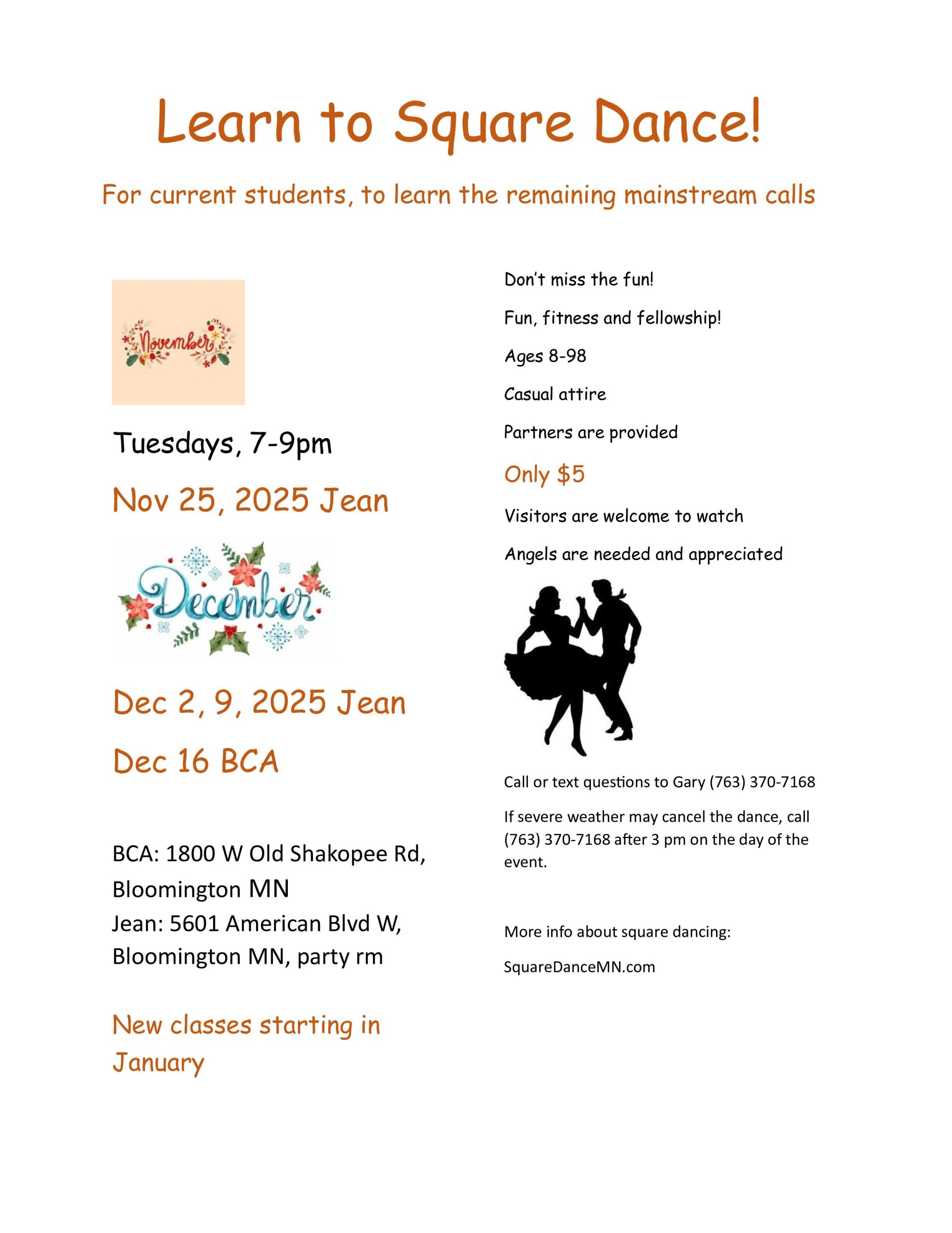 Square Dance Class (Caller/Instructor Larry Fruetel “Mainstream Class” 7:00-9:00 pm). Casual attire. Bring your favorite Christmas Treat. For current students, to learn the remaining mainstream calls. Spares & Pairs Flyer