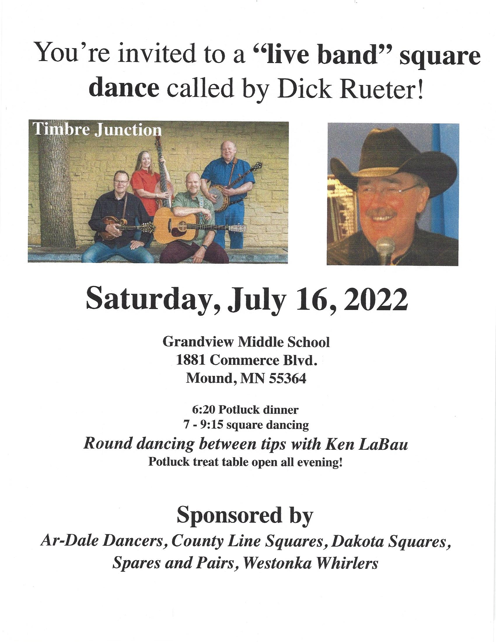 Ar-Dale Dancers, County Line Squares, Dakota Squares, Spares & Pairs, and Westonka Whirlers “Timbre Junction“ Square Dance (Potluck dinner – 6:20-7:00 pm; Caller Tom Allen – “Mainstream” 7:00-9:15 pm; Cuer Ken LaBau – “Rounds” between tips”), potluck treat table open all evening. Timbre Junction Flier