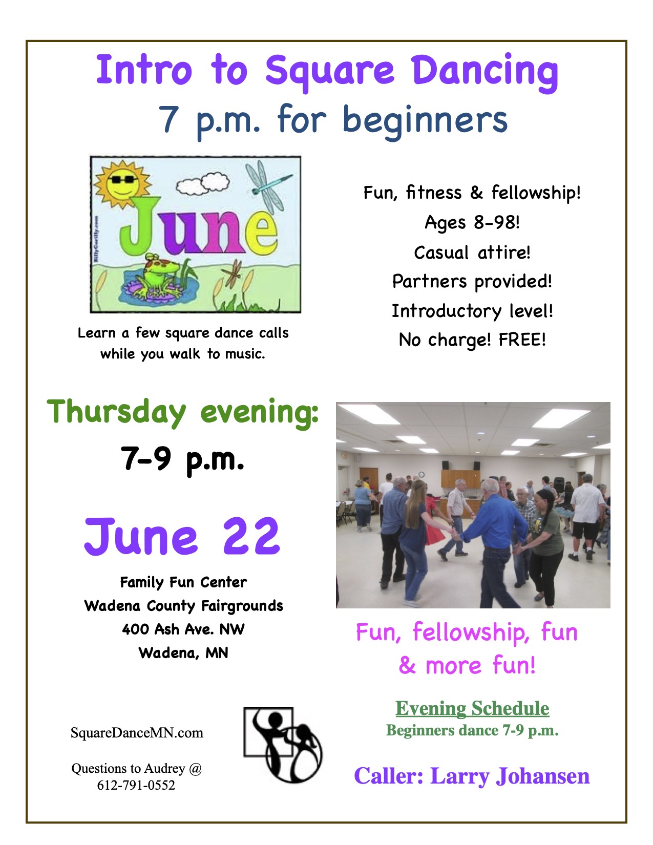 Intro to Square Dancing (Caller Larry Johansen – “Beginner Square Dancing” 7:00-9:00 pm). Wadena Whirlaways Flier