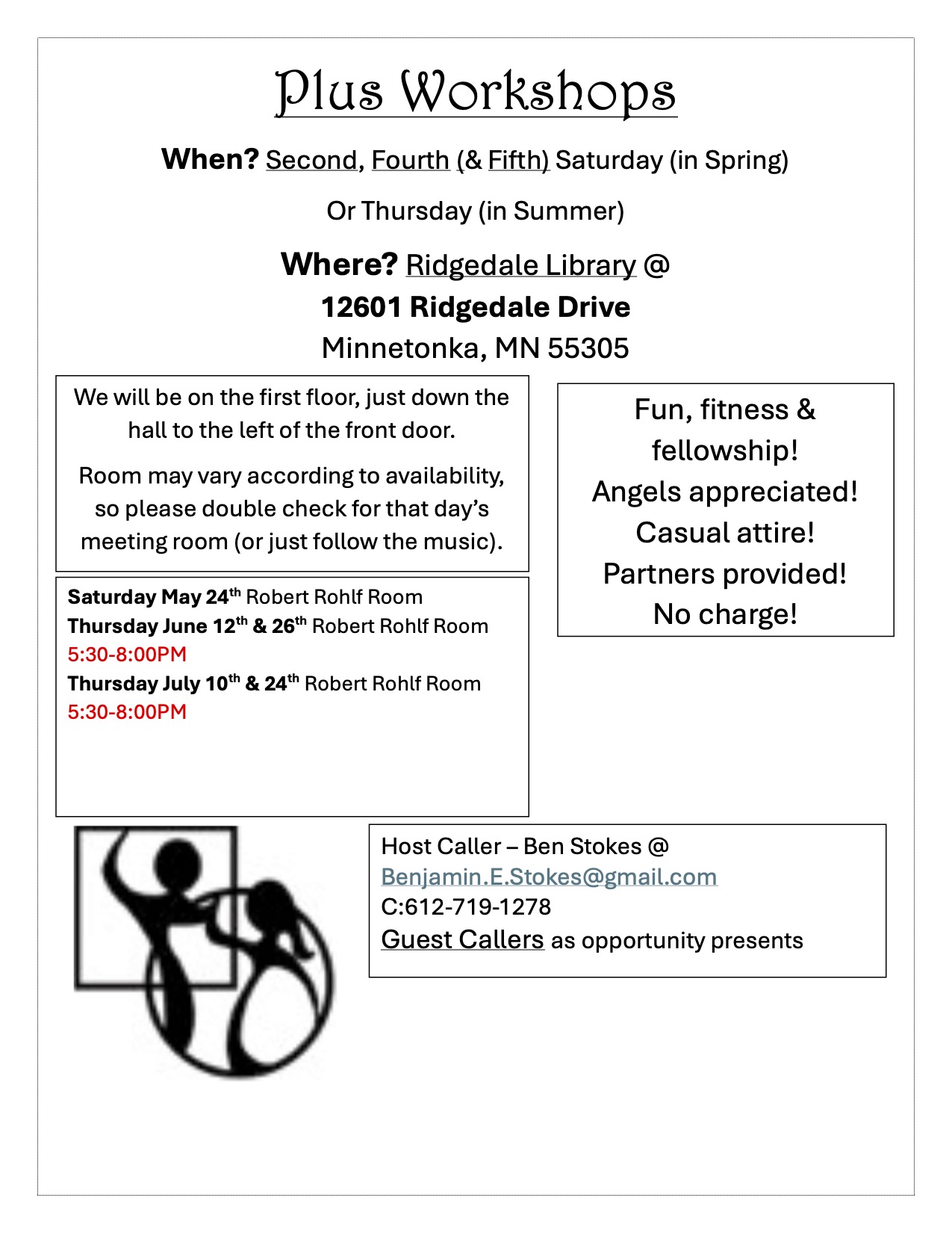West Metro Plus Workshop (Caller/Instructor Ben Stokes – “Plus” workshop 9:30-11:30 am). May be starting as early as 9:00 am if room is available. Angels needed and appreciated. If you have particular calls you would like to practice, let him know and he’ll focus on them. A little lead-time helps in preparing materials. West Metro Plus Workshop Flyer
