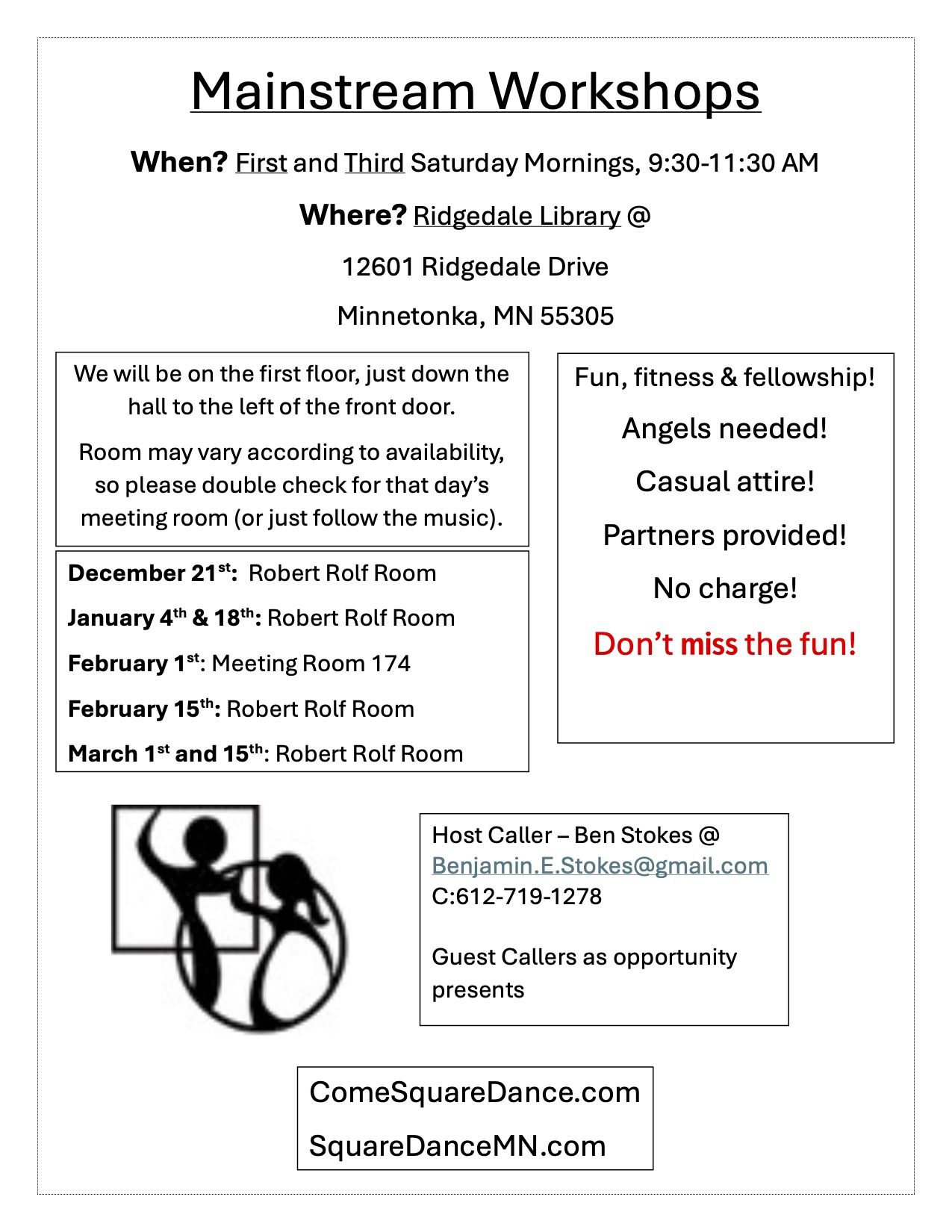 West Metro Mainstream Workshop (Caller/Instructor Ben Stokes – “Mainstream” workshop 9:30-11:30 am). May be starting as early as 9:00am if room is available. Angels needed and appreciated. If you have particular calls you would like to practice, let him know and he’ll focus on them. A little lead-time helps in preparing materials. West Metro Workshop
