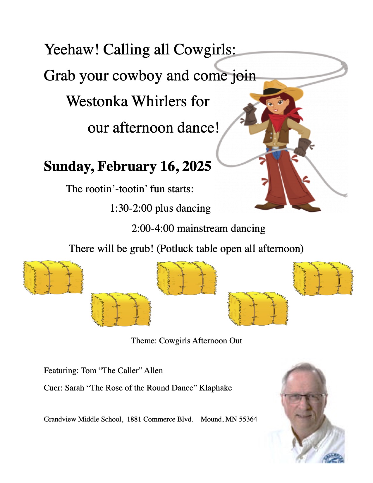 “Cowgirls Afternoon Out” Square Dance (Caller Tom Allen – “Plus” 1:30-2:00 pm, “Mainstream” 2:00-4:00 pm; Cuer Sarah Klaphake – “Rounds” between tips), potluck table during dance. Westonka Whirlers Flyer