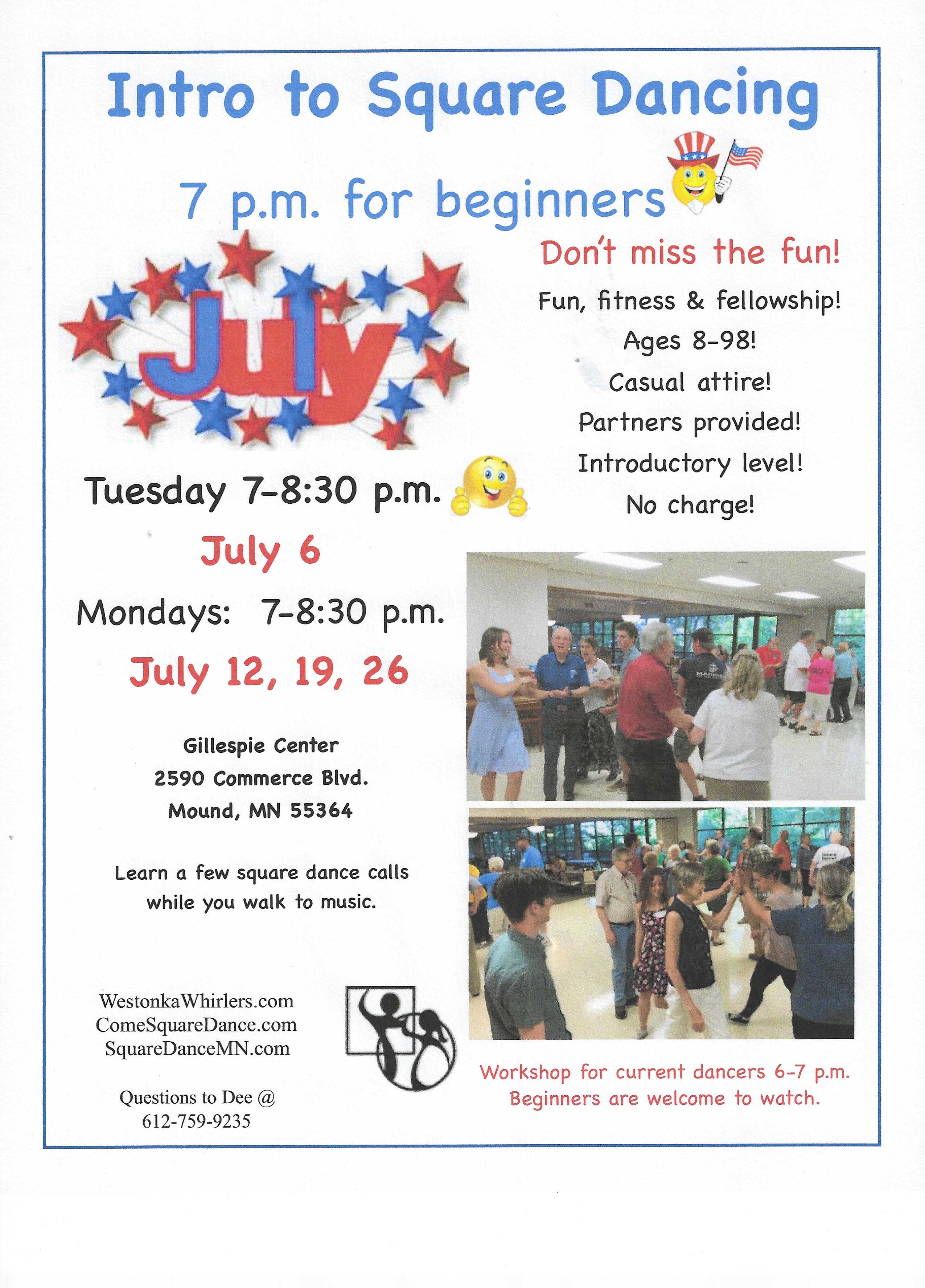 Intro to Social Square Dancing (“Mainstream Workshop” 6:00-7:00 pm, “Beginner Square Dancing” 7:00-8:30 pm). Westonka Whirlers Flier