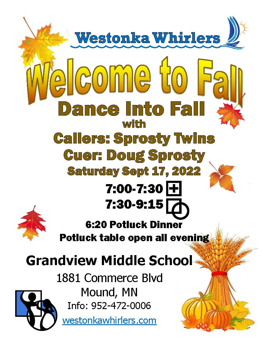 “Welcome to Fall” Square Dance (potluck dinner at 6:20 pm; Caller Don and Doug Sprosty – “Plus” 7:00-7:30 pm, “Mainstream” 7:30-9:15 pm; Cuer Doug Sprosty – “Rounds” between tips), potluck table during dance. Westonka Whirlers Flier