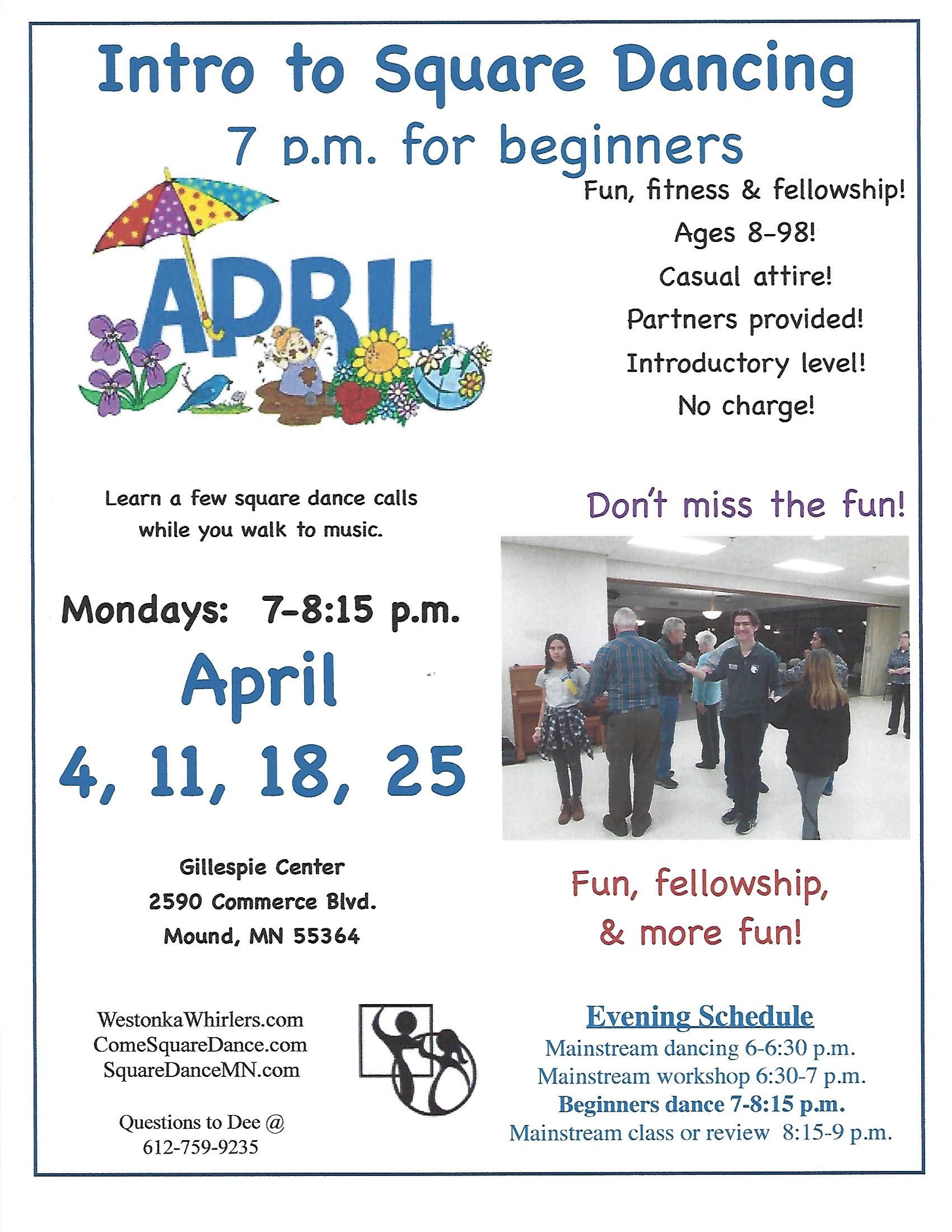 Intro to Square Dancing (“Mainstream” 6:00-6:30 pm, “Mainstream Workshop” 6:30-7:00 pm, “Beginner Square Dancing” 7:00-8:15 pm, “Mainstream Class or Review” 8:15-9:00 pm). Westonka Whirlers Flier