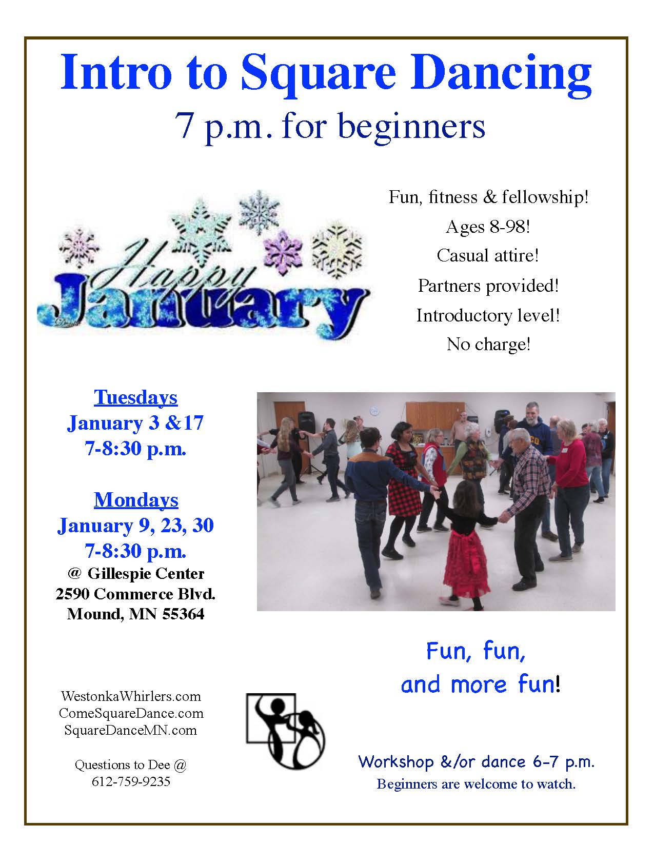 Intro to Square Dancing (“Mainstream Workshop” 6:00-7:00 pm, “Beginner Square Dancing” 7:00-8:30 pm). Westonka Whirlers Flier