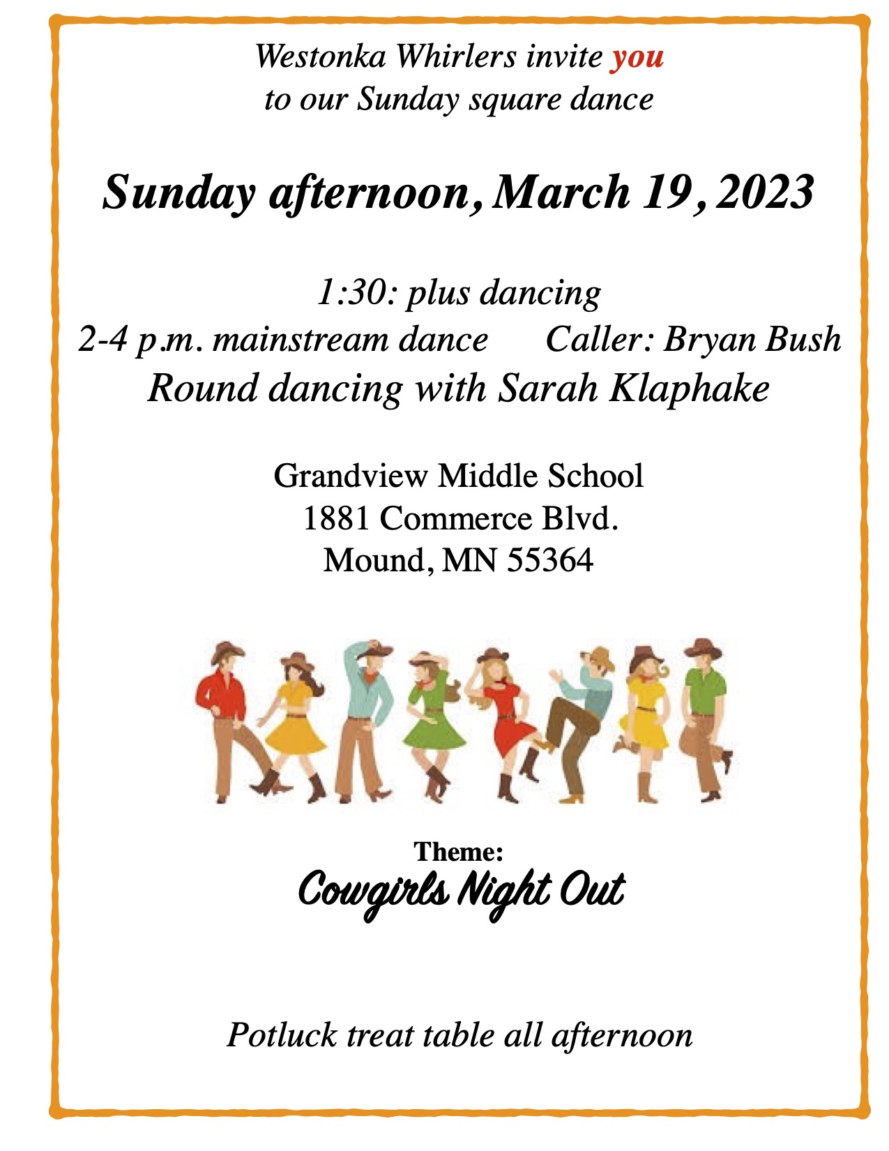 “Cowgirls Night Out” Square Dance (Caller Bryan Bush – “Plus” 1:30-2:00 pm, “Mainstream” 2:00-4:00 pm; Cuer Sarah Klaphake – “Rounds” between tips), potluck table during dance. Westonka Whirlers Flier