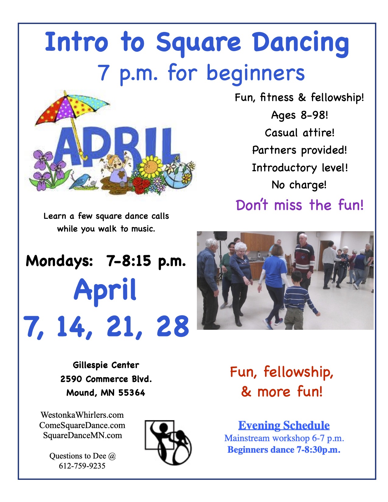 Intro to Square Dancing (“Mainstream Workshop” 6:00-7:00 pm, “Beginner Square Dancing” 7:00-8:15 pm). Westonka Whirlers Flyer