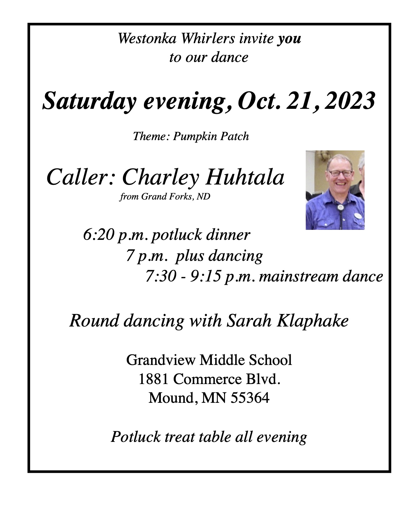 “Pumpkin Patch” Square Dance (Potluck dinner – 6:20-7:00 pm; Caller Charley Huhtala – “Plus” 7:00-7:30 pm, “Mainstream” 7:30-9:15 pm; Cuer Sarah Klaphake – “Rounds” between tips), potluck table during dance. Westonka Whirlers Flier