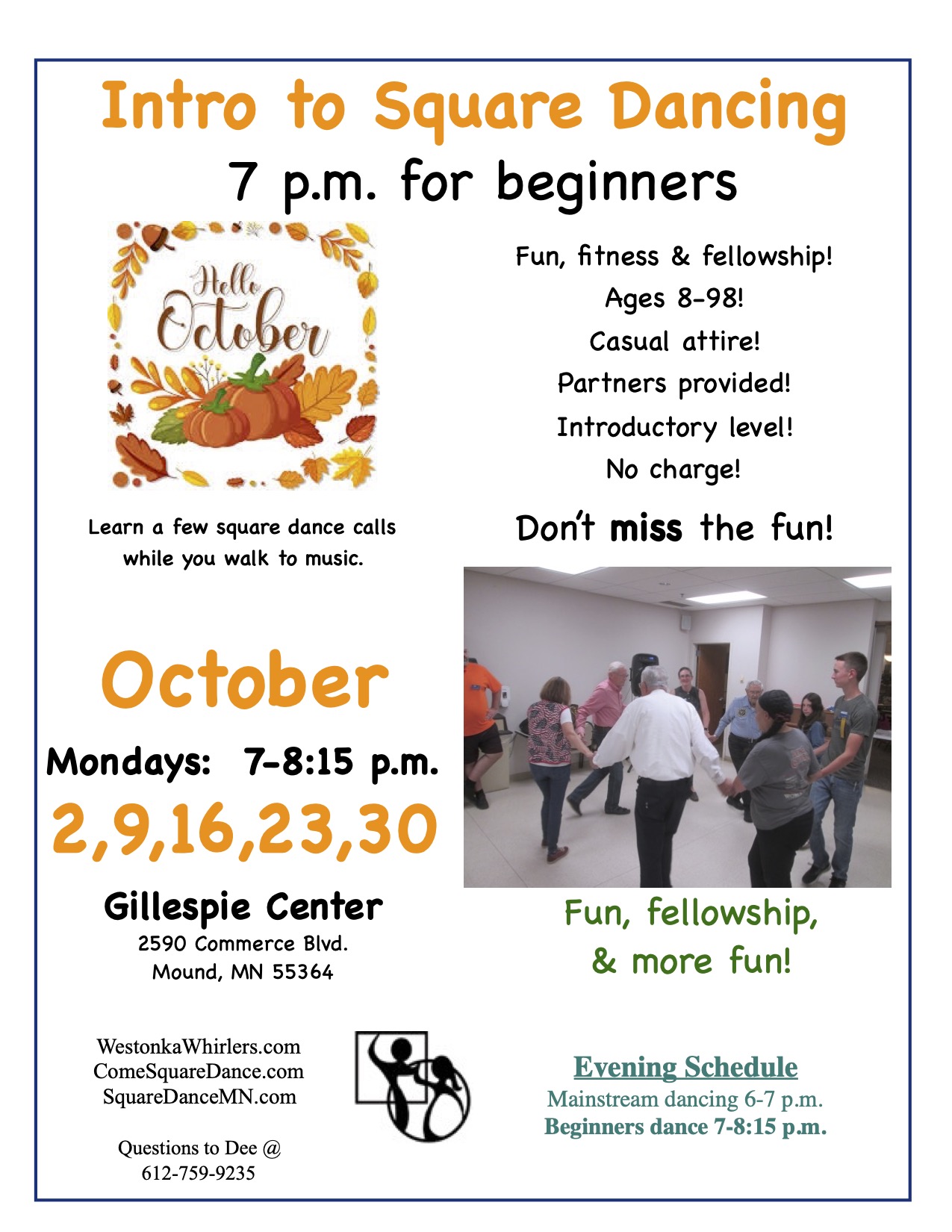 Intro to Square Dancing (“Mainstream Workshop” 6:00-7:00 pm, “Beginner Square Dancing” 7:00-8:15 pm). Westonka Whirlers Flier