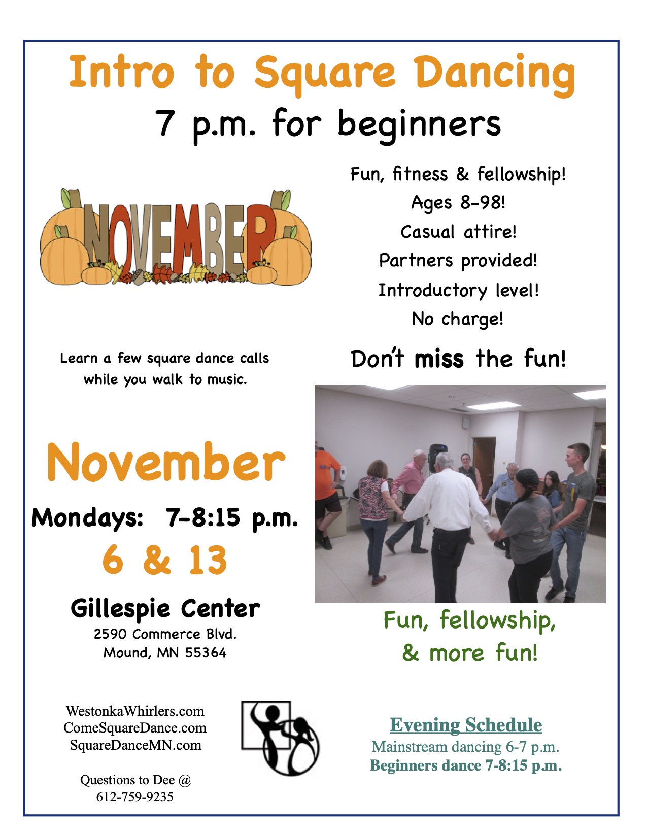 Intro to Square Dancing (“Mainstream Workshop” 6:00-7:00 pm, “Beginner Square Dancing” 7:00-8:15 pm). Westonka Whirlers Flier