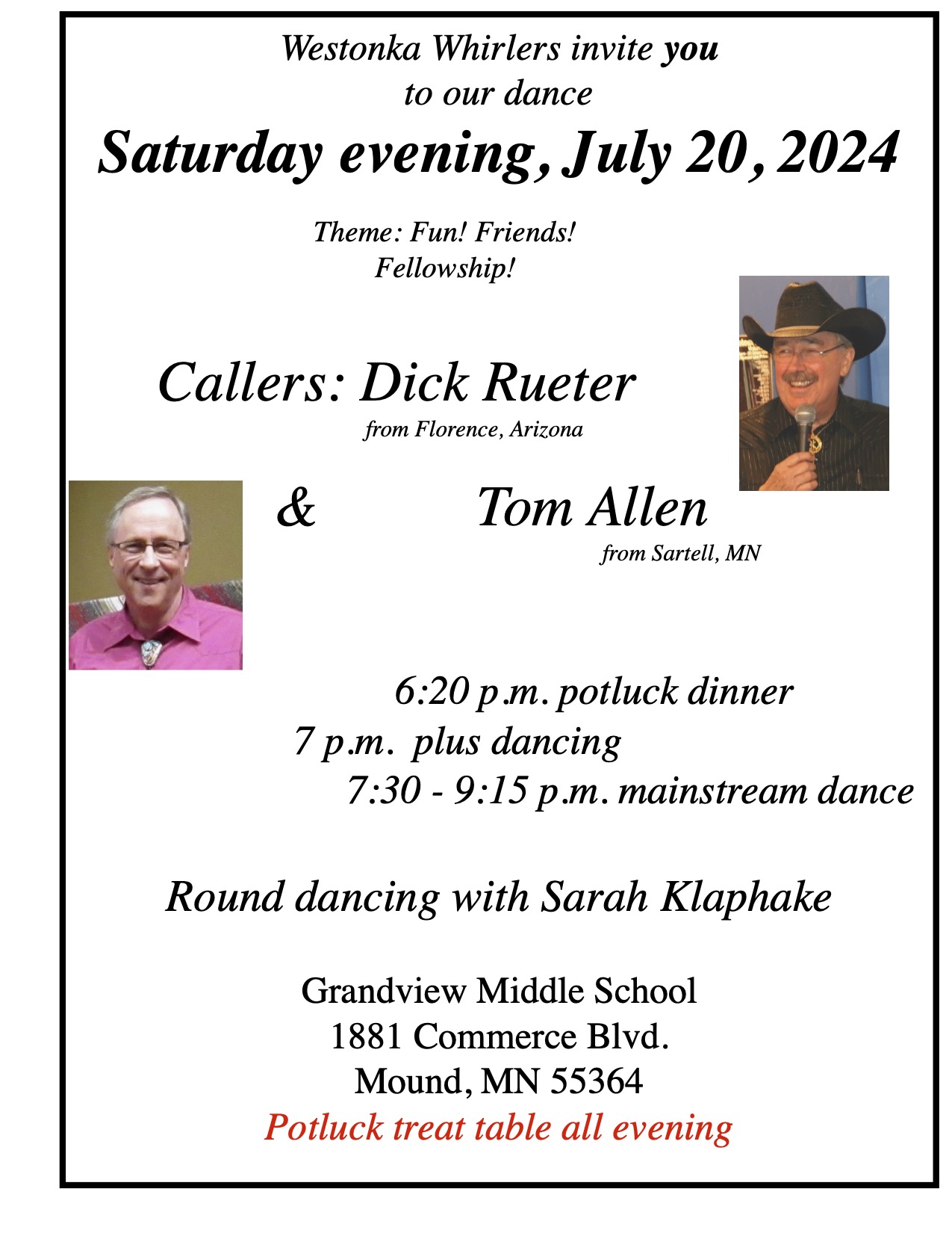 “Fun! Friends! Fellowship!” Square Dance (Potluck dinner – 6:20-7:00 pm; Callers Dick Rueter & Tom Allen – “Plus” 7:00-7:30 pm, “Mainstream” 7:30-9:15 pm; Cuer Sarah Klaphake – “Rounds” between tips), potluck table during dance. Westonka Whirlers Flyer