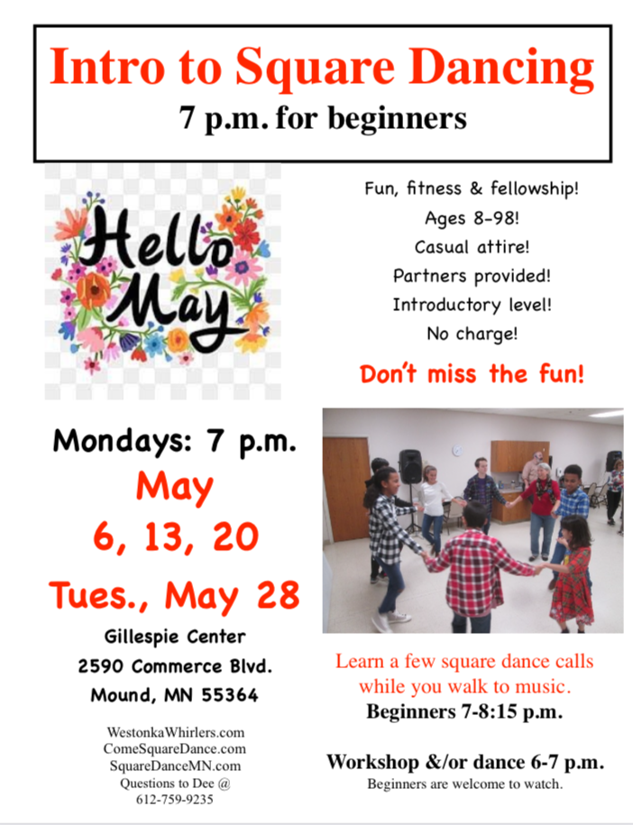 Intro to Square Dancing (“Mainstream Workshop” 6:00-7:00 pm, “Beginner Square Dancing” 7:00-8:15 pm). Westonka Whirlers Flyer