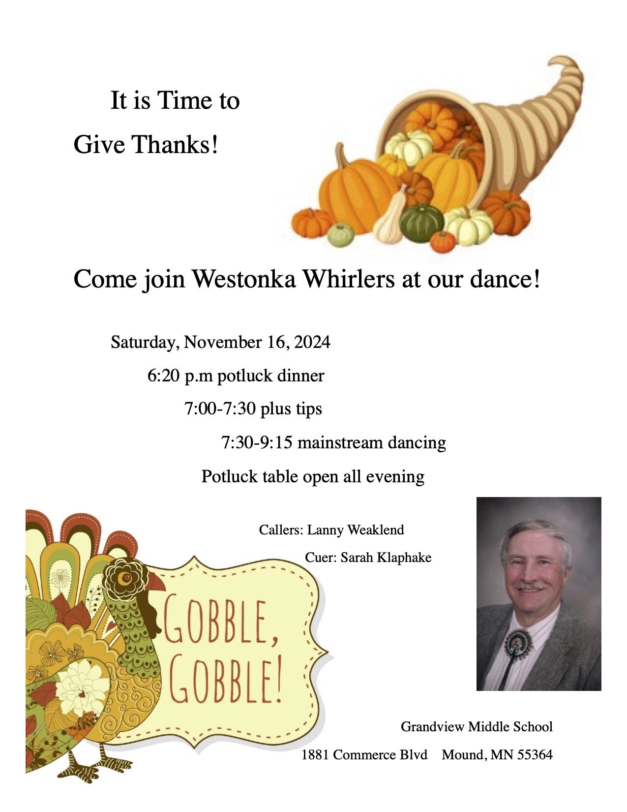 “Time to Give Thanks!” Square Dance (Potluck dinner – 6:20-7:00 pm; Caller Lanny Weaklend – “Plus” 7:00-7:30 pm, “Mainstream” 7:30-9:15 pm; Cuer Sarah Klaphake – “Rounds” between tips), potluck table during dance. Westonka Whirlers Flyer