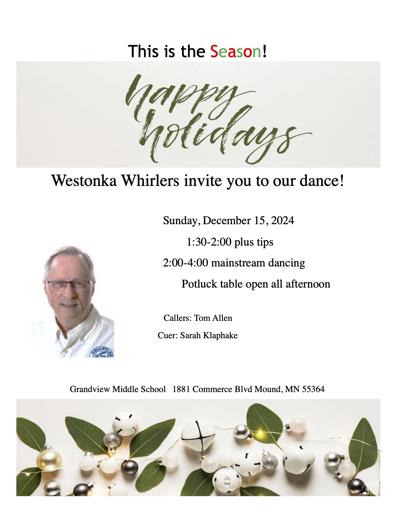 “This is the Season” Square Dance (Caller Tom Allen – “Plus” 1:30-2:00 pm, “Mainstream” 2:00-4:00 pm; Cuer Sarah Klaphake – “Rounds” between tips), potluck table during dance. Silent auction on lots of unique items. Westonka Whirlers Flyer