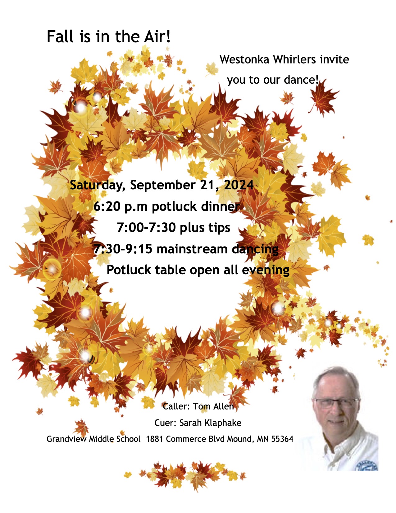 “Fall’s in the Air” Square Dance (Potluck dinner – 6:20-7:00 pm; Caller Tom Allen – “Plus” 7:00-7:30 pm, “Mainstream” 7:30-9:15 pm; Cuer Sarah Klaphake – “Rounds” between tips), potluck table during dance. Westonka Whirlers Flyer
