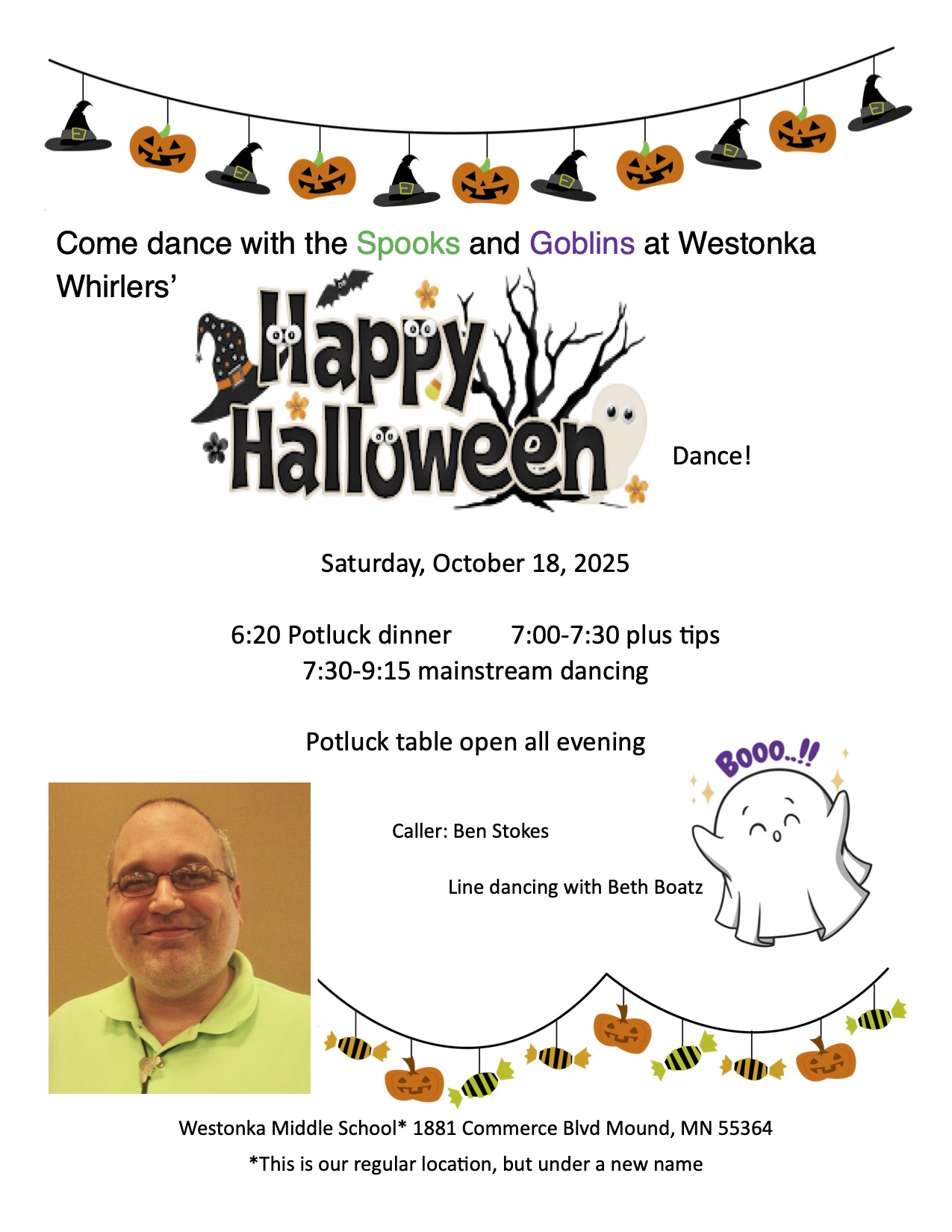 “Spooks and Goblins” Square Dance Dance (Potluck dinner – 6:20-7:00 pm; Caller Ben Stokes – “Plus” 7:00-7:30 pm, “Mainstream” 7:30-9:15 pm; Cuer Beth Boatz – “Line Dancing” between tips), potluck table during dance. Special silent auction of belt buckles, bolos, women’s jewelry, etc. Note location name change. Westonka Whirlers Flyer
