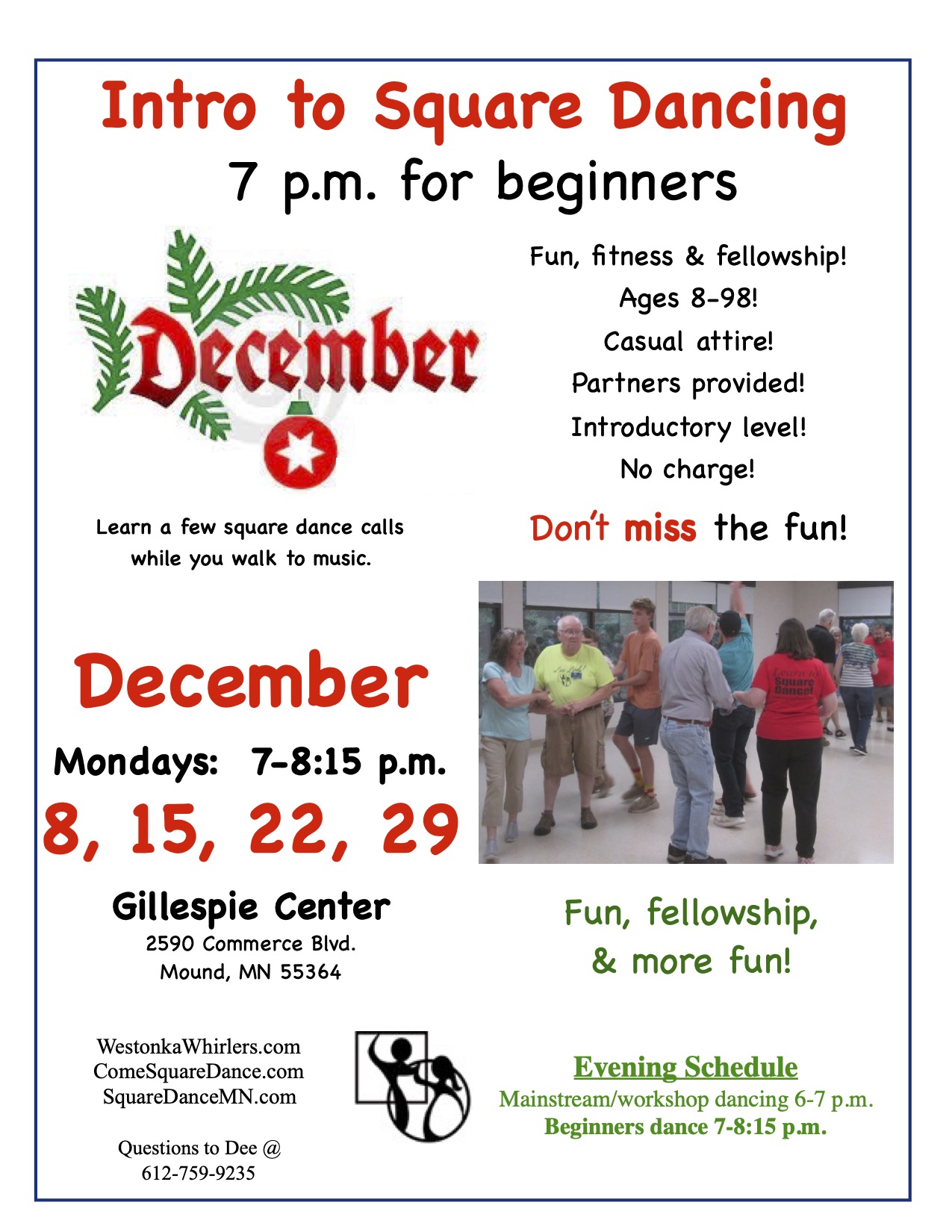 Intro to Square Dancing (“Mainstream Workshop” 6:00-7:00 pm, “Beginner Square Dancing” 7:00-8:15 pm). Free! Casual attire. Westonka Whirlers Flyer