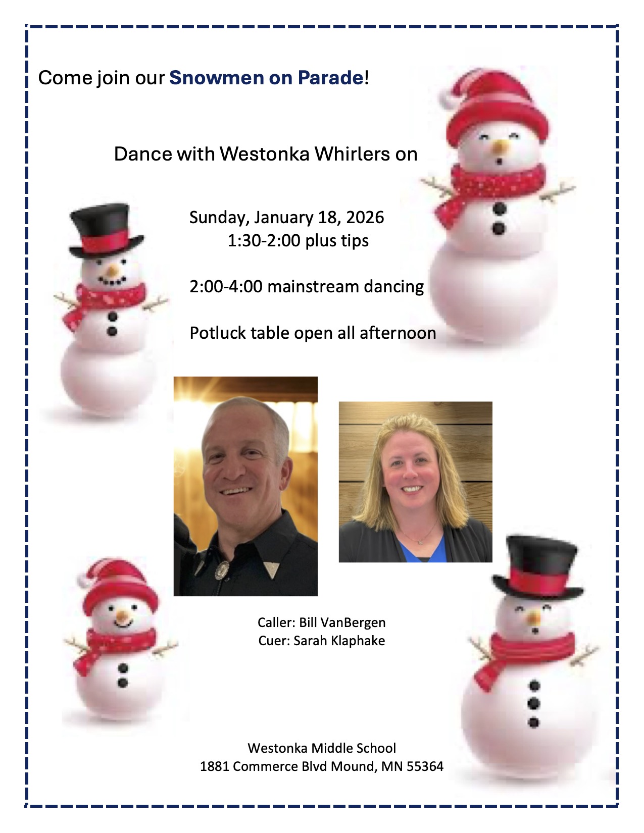 “Snowmen on Parade” Square Dance (Caller Bill VanBergen – “Plus” 1:30-2:00 pm, “Mainstream” 2:00-4:00 pm; Cuer Sarah Klaphake – “Round Dancing” between tips). Potluck table during dance. Westonka Whirlers Flyer