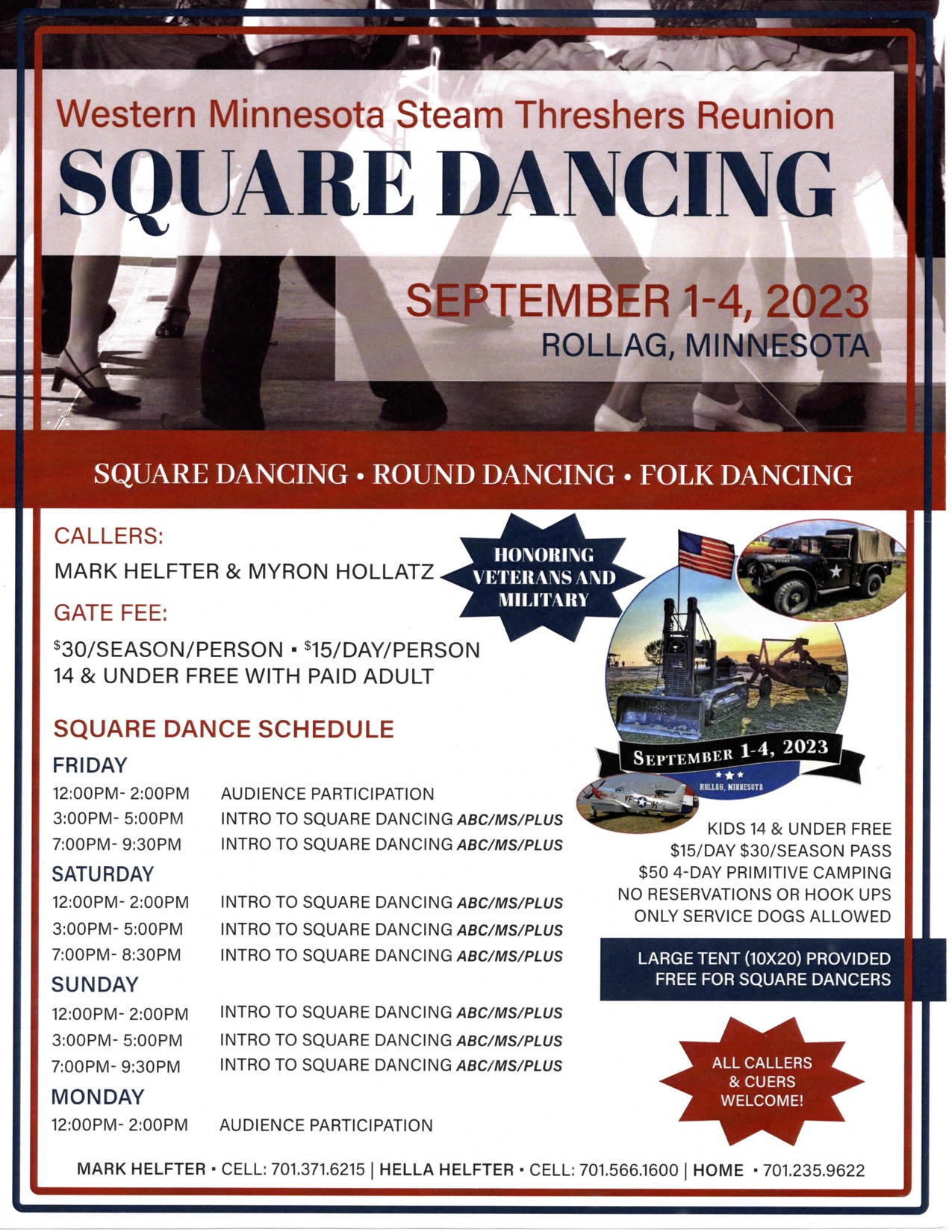 “Western Minnesota Steam Threshers Reunion” (Callers Mark Helfter and Myron Hollatz – Squares, Rounds, and Folk Dancing; audience participation 12:00-2:00 pm). Gate fee: season – $30.00; day – $15.00; 14 and under with a paid adult – free. WMSTR Flier